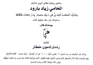 Randa Khattar, auteure libanaise et prix littéraire Naji Naaman (prix du mérite, 2009), vient de signer «Yawmazaka Qal: Ghanni», édité par la MNAC, à la municipalité de Zouk Mosbeh (kesrouan, Liban), sous les bonnes auspices de l’ancien ministre Maître Ziad Baroud qui a donné une allocution. Ont pris la parole aussi Charbel Merheb, Joseph Mghamés et l’auteure. Quant à Maya Chédid, elle a performé une chanson écrite et composée par Mme Khattar. Plusieurs parutions de la FCG ont été distribuées gratis au grand public au cours du vin d’honneur. ةtaient présents: Habib Younis, Toni Danayan, Samir Abou Samra, Louis Bou Farah, Claude Zakka et Joseph Khoury.