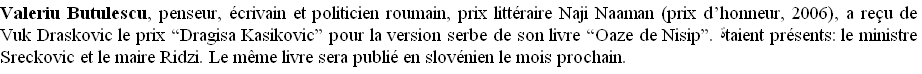Valeriu Butulescu, Romanian aphorist and politician, bearer of Naji Naaman’s Literary Prize (honor prize, 2006), is honored in the city of Turino (Italy) for the publishing of his book «Oase de Nisip» in Italian, with the help of Fabrizio Caramagna (Naji Naaman’s Literary Prize, honor prize, 2011), Alina Breje and Sandro Gros-Pietro. «Oase de Nisip» was published by MNAC within its free of charge series of literary books in Arabic, Armenian, Persian and Syriac!