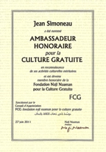 Jean Simoneau, écrivain canadien, Prix Littéraire Naji Naaman (prix de créativité, 2010), vient d’être nommé Ambassadeur Honoraire pour la Culture Gratuite par la FCG.