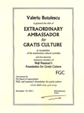 Valeriu Butulescu, penseur, écrivain et politicien roumain, prix littéraire Naji Naaman (prix d’honneur, 2006), est nommé ambassadeur extraordinaire pour la culture gratuite par la FCG.
