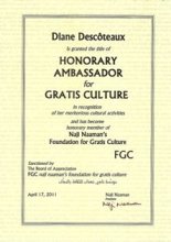 Diane Descôteaux, poétesse classique et haïjin canadienne, Prix Littéraire Naji Naaman (prix d’honneur, 2009), vient d’être nommée Ambassadrice Honoraire pour la Culture Gratuite par la FCG.