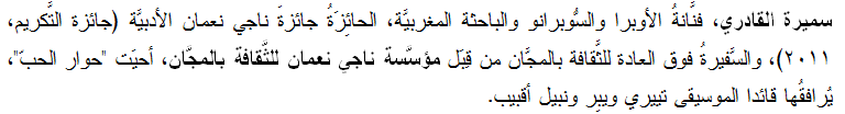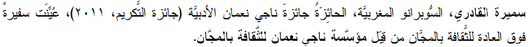 تقاسمَت سميرة القادري، السُّوبرانو المغربيَّة، الحائزة جائزةَ ناجي نعمان الأدبيَّة (جائزة التَّكريم، 2011)، والسَّفيرة فوق العادة لمؤسَّسة ناجي نعمان للثَّقافة بالمجَّان، جائزةَ شخصيَّة العام الثَّقافيَّة، المَمنوحة من قِبَل صحيفة "المُهاجر" الأُستراليَّة والمنظَّمة الثَّقافيَّة التَّابعة لها، مع الشَّاعر محمَّد حلمي الرِّيشة
