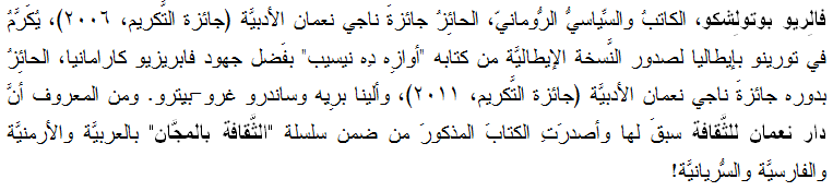 نالَ المُفَكِّرَ والكاتِبَ والسِّياسيَّ الرُّومانيّ فالِريو بوتولِشكو، الحائز جائزةَ ناجي نعمان الأدبيَّة (جائزة التَّكريم، 2006)، جائزةَ "دراغيزا كاسيكوفِتْش" عن التَّرجمة الصِّربيَّة لكتابه "أوازِه دِه نيسيب". وكان بين الحاضِرين الوزير سْرِكوفِتْش ورئيس البلديَّة رِدْزي. وأمَّا طبعة الكتاب بالسّلوفانيَّة فستصدر في الشَّهر المُقبِل. يُذكرُ أنَّ دار نعمان للثَّقافة أصدرت ترجماتٍ أربعَ للكتاب المذكور، بالعربيَّة والأرمنيَّة والسُّريانيَّة والإيرانيَّة، من ضمن سلسلة "الثَّقافة بالمجَّان
