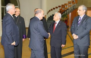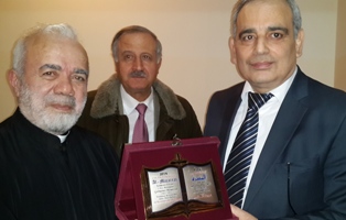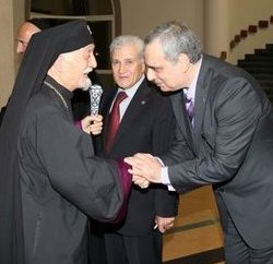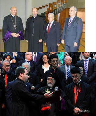 Naji Naaman presented and dedicated the first copy of his gratis volume entitled «Mi’atun wa Tastamirrul-Ibada» («One hundred years after, the genocide continues») to His Beatitude the Armenian Catholic Patriarch Nerses Bedros XIX at the Patriarchal Seat (Beirut) in presence of Monsignor Georges Yéghéyan and Marwan Naaman.