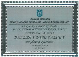 Valeriu Butulescu, penseur, écrivain et politicien roumain, prix littéraire Naji Naaman (2006) et ambassadeur pour la culture gratuite (FCG) depuis 2011, reçoit en Bulgarie le Prix International Aleko (Konstantinov) pour la Nouvelle Humouristique. Ils étaient 25 concourants venus de 16 pays, et c’est Valeriu qui l’a emporté!